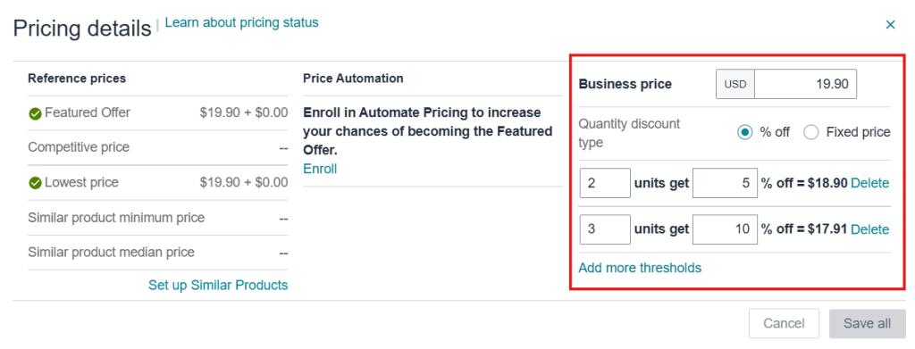 Why You Should Utilize Business Pricing on Amazon Maria, October 29, 2024June 2, 2025 Amazon’s Business Pricing is a powerful tool for sellers who want to tap into the lucrative B2B market on Amazon. By setting specific pricing for business customers, you can increase sales volume, attract bulk buyers, and build long-term relationships with companies looking for reliable suppliers. Here are the main reasons why utilizing business pricing on Amazon can give your brand a competitive edge. 1. Attract Business Buyers with Competitive PricingAmazon Business Pricing lets you set a dedicated price for business customers, separate from regular retail prices. Businesses often buy in larger quantities and look for discounts or pricing flexibility to maximize their budgets. By offering exclusive pricing, you can stand out among competitors and draw in more business buyers. The pricing can look like this–Buy 2, get 10% or Buy 3, get 15%. 2. Increase Order VolumesWhen businesses see discounted rates for bulk purchases, they’re more likely to place larger orders. Amazon’s Business Pricing tool allows you to set tiered discounts, which means that the more a customer buys, the lower the price per unit. This strategy encourages high-volume purchases, leading to higher order values and, potentially, more stable cash flow. 3. Build Customer LoyaltyBusinesses prefer suppliers who offer transparency, value, and consistency. With Amazon Business Pricing, you can establish yourself as a trusted vendor, fostering loyalty and encouraging repeat purchases. Business customers who find great value in your offerings may return for regular orders, which can provide a reliable revenue stream. 4. Enhance Your Brand’s Visibility in the B2B MarketBy utilizing business pricing, your products become part of Amazon’s B2B marketplace, where businesses specifically search for bulk deals and suppliers. This added visibility can expand your customer base and boost brand recognition among professional buyers. How to Setup Business Pricing? Go to Manage Inventory and click on ‘View reference and business prices’ on one of the listings. Then enter the business price and threshold that you want. Once you’ve set up B2B pricing, you can check performance in Menu > B2B > B2B Central. Here’s a snapshot of the B2B dashboard: In summary, Amazon’s Business Pricing feature is an invaluable tool for sellers looking to grow in the B2B space and leverage Amazon’s extensive network of business buyers. Got questions or suggestions? Drop a comment or send me an email. Did You Know